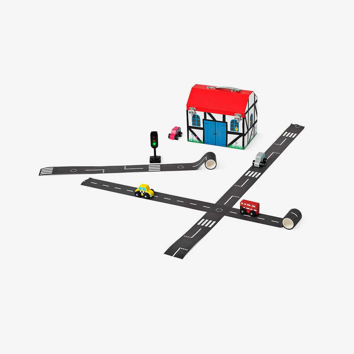 Create endless playtime adventures with this road tape, perfect for imaginative car and city play. Made of paper, it measures 4,8 x 6 cm and unrolls to a total length of 8 metres, offering plenty of space for creative setups. The black tape features a classic road design that sticks easily to most smooth surfaces and can be removed without leaving marks. Children can design their own streets, parking areas, and racing tracks, turning any floor or table into a busy play scene. Easy to cut and shape, this road tape adds excitement and variety to toy car play, making every game feel new and inventive. Roll it up and pop it in your pocket along with your favourite toy car for fun anywhere, any time.